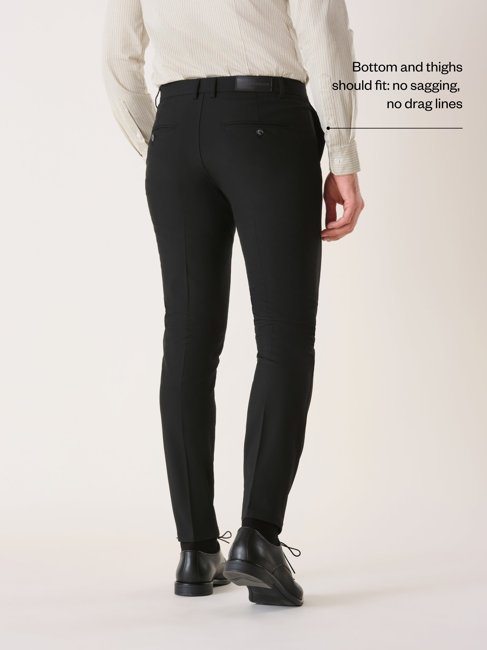 Ta en ordentlig titt på din rumpa. Tyget ska inte hänga ned över den och den ska inte ha konstiga veck. Detsamma gäller låren.