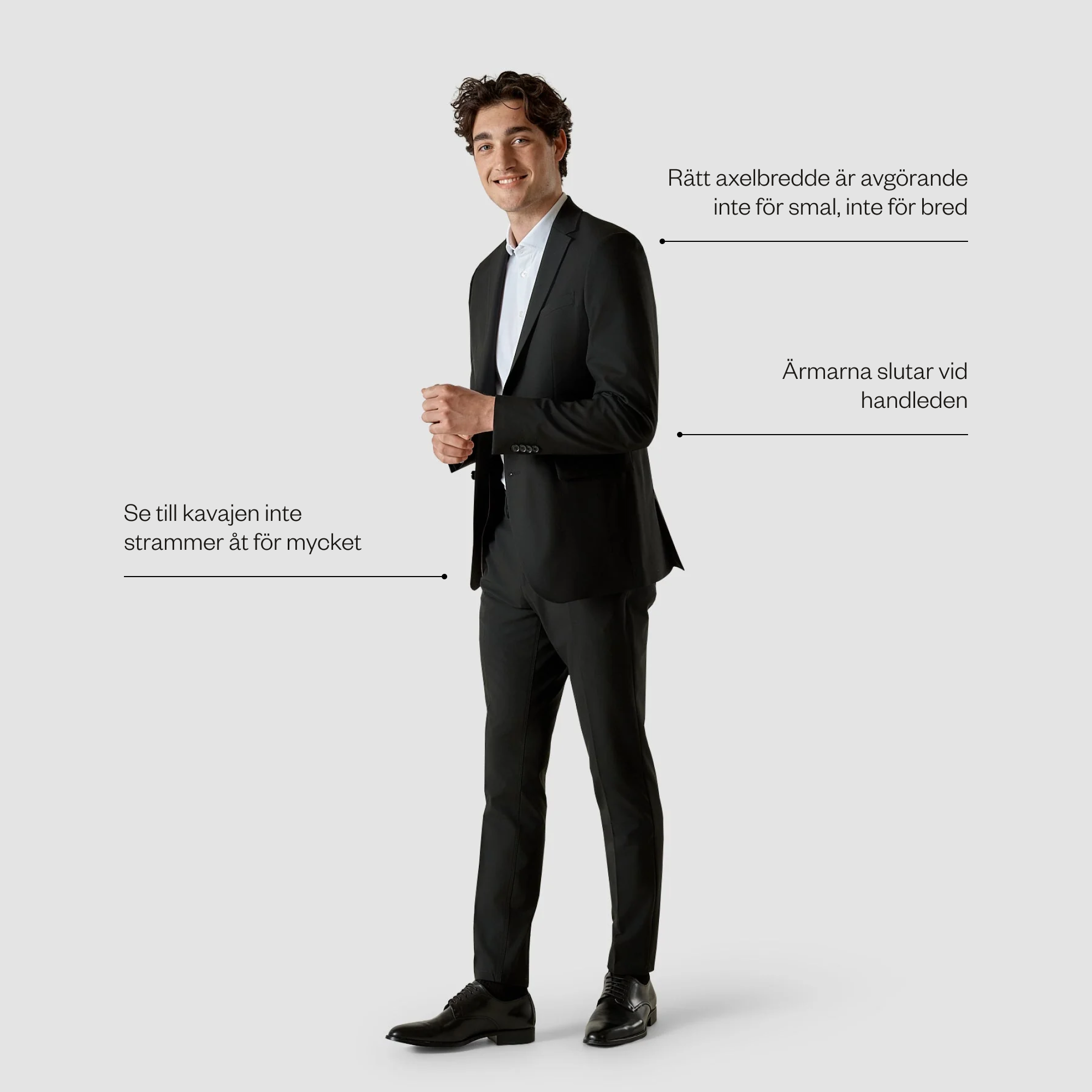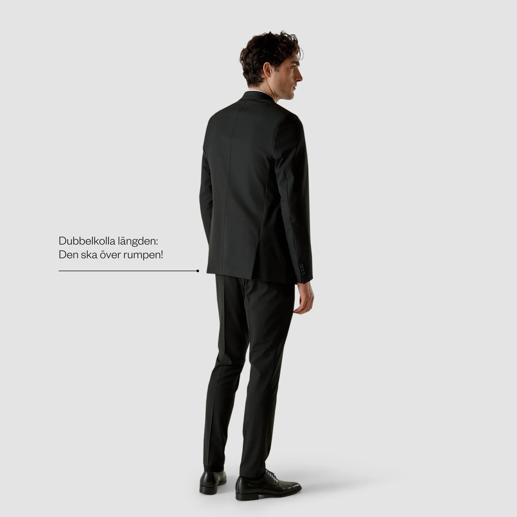 Du tycker kanske att det är svårt att avgöra om en kavaj eller kostym sitter bra, speciellt om du inte använder dem så ofta. Och när det kommer till kritan är ingenting så viktigt som den perfekta passformen. Kontrollera först och främst om längden är rätt: den ska gå ned över rumpan. Se också till att kavajen inte är för tight. Du kan se små draglinjer i tyget längs med knapparna på framsidan om det är det. På tal om knappar: den nedersta ska alltid vara uppknäppt!